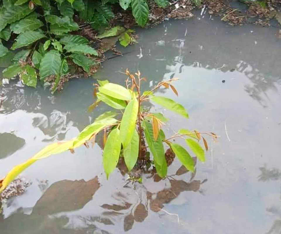 Tình trạng ngập thường xuất hiện do mưa lớn liên tục kết hợp hệ thống thoát nước không đảm bảo. Một số vườn lên liếp thấp, không có mương xả phụ, khiến nước mưa đọng lại lâu ngày. Ngoài ra, việc phủ bạt nilon, trồng dày hoặc làm cỏ sát gốc cũng khiến nước khó thoát.